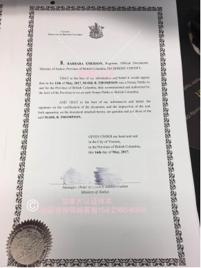 認(rèn)證即認(rèn)可文書上的簽字和印章的真實性,使加拿大出具的認(rèn)證文書能被中國當(dāng)?shù)氐南嚓P(guān)部門承認(rèn),不致因懷疑文件上的簽名或印章是否屬實而影響有關(guān)文書的法律效力。
