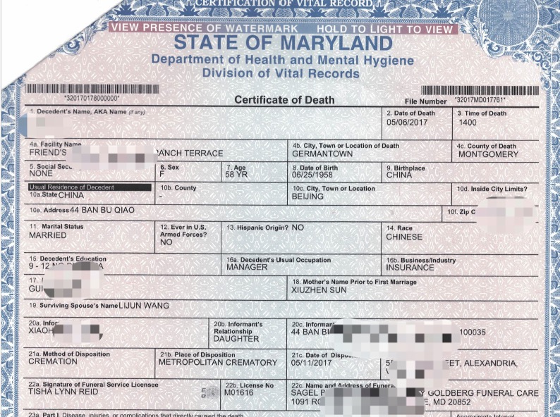 在美國意外或病故死亡的中國公民或美國公民,在涉及到中國國內(nèi)房產(chǎn)或其他繼承權(quán)等問題時(shí),國內(nèi)相關(guān)辦事部門會(huì)要求家屬提供死者在美國的死亡證明。此死亡證明必須要經(jīng)過中國駐美大使館或者領(lǐng)事館的公證認(rèn)證才能被國內(nèi)機(jī)構(gòu)認(rèn)可。